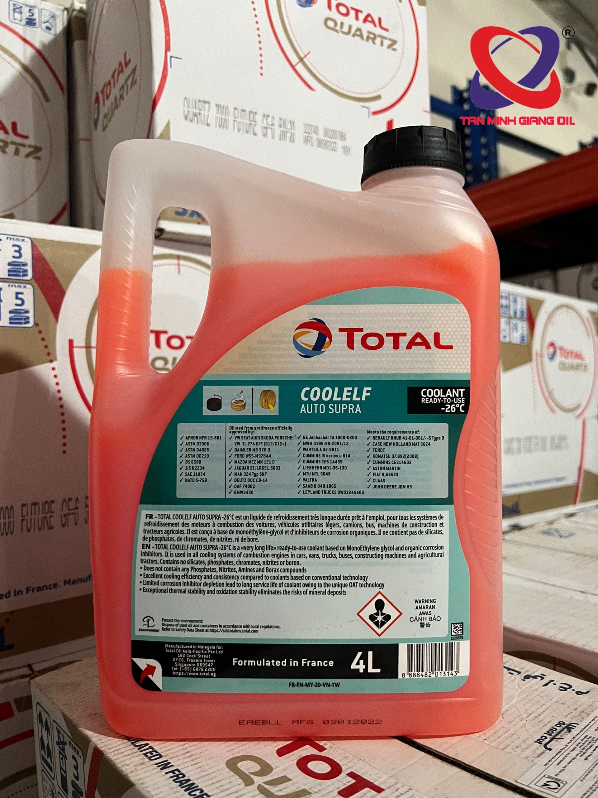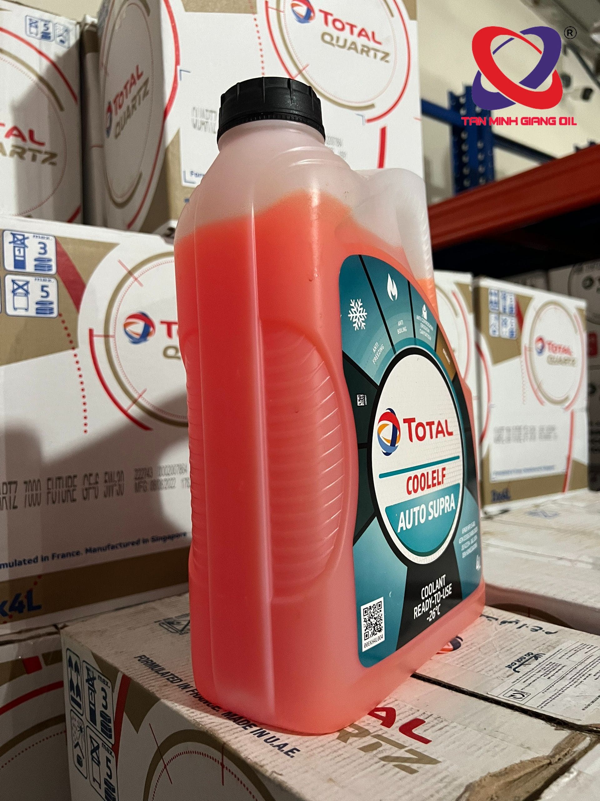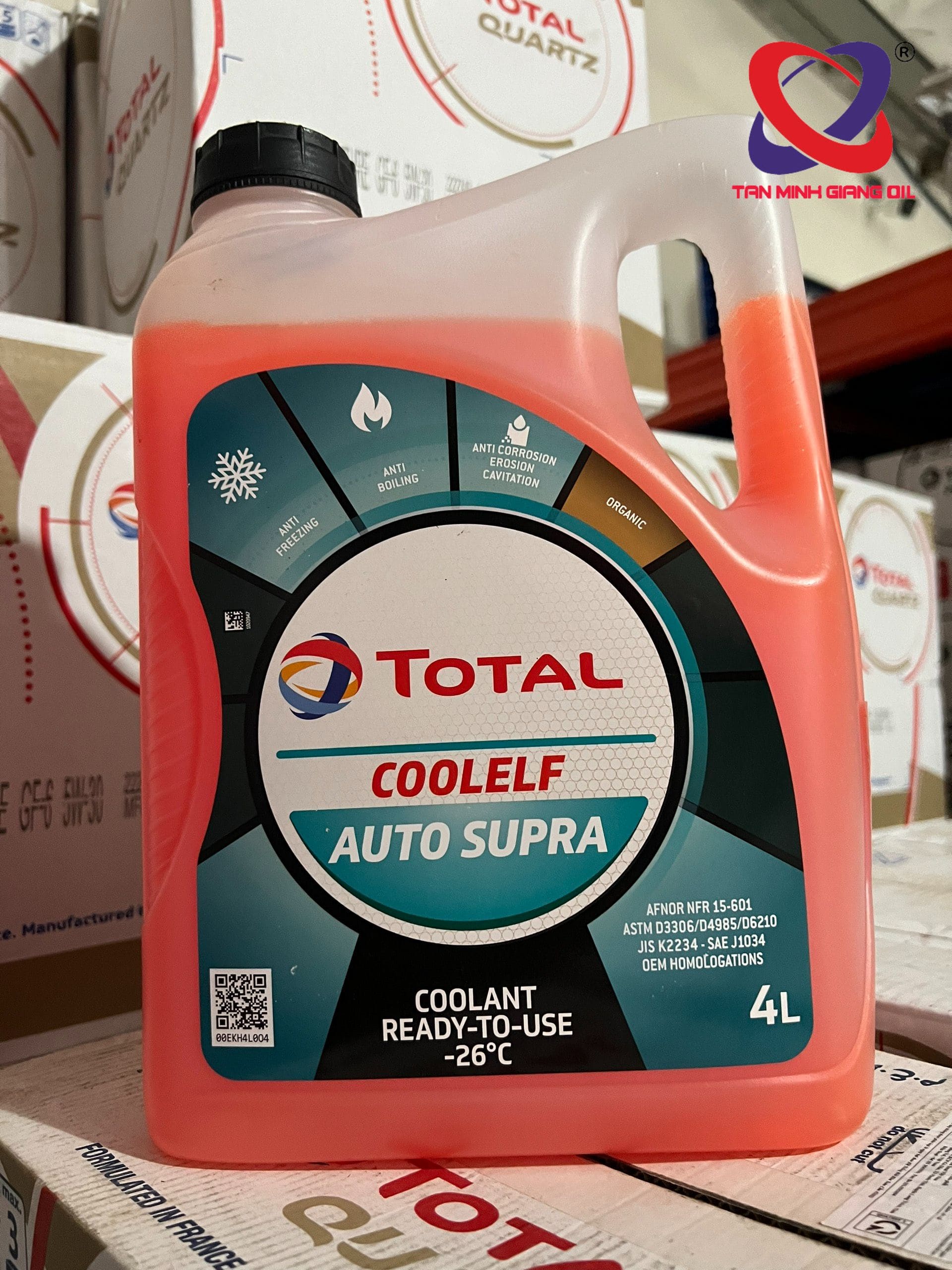 - Nước làm mát cao cấp TOTAL COOLELF AUTO SUPRA- 26°C đảm bảo độ chống đông lên đến -26°C.